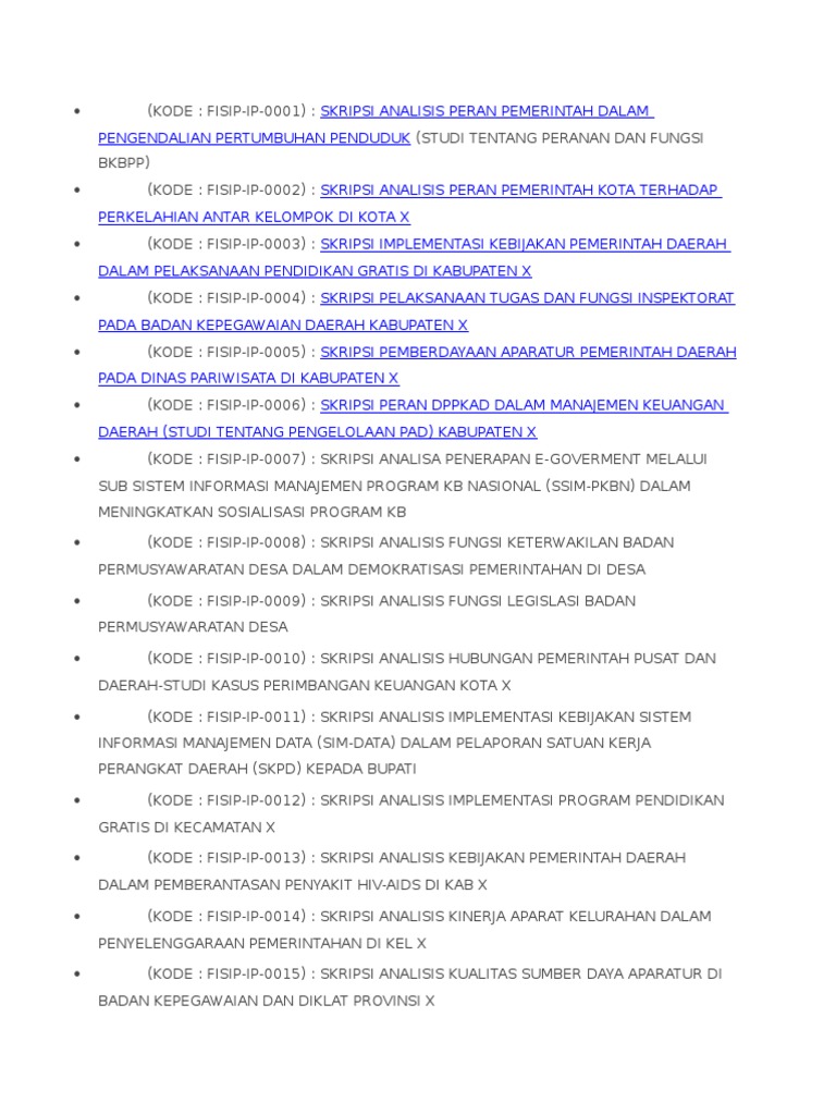 38 Referensi Skripsi Ilmu Pemerintahan Terlengkap Nurhamka Blog from i0.wp.com Rekrutmen calon kepala daerah melalui partai politik dalam pemilihan kepala daerah di kota baubau sulawesi tenggara tahun 2012 (studi kasus pan) ditulis ole : Di bawah ini kami menyediakan refrensi judul contoh skripsi ilmu sosial dengan berbagai studi kasus yang terbaru mulai dari program raskin, partisipasi pejabat. Contoh proposal tesis ilmu politik~ ilmu politik merupakan cabang ilmu sosial yang mempelajari tentang teori dan praktek politik, deskripsi dan analisa sistem politik serta perilaku politik. Skripsi implementasi kebijakan pemerintah daerah dalam pelaksanaan pendidikan. No nama mahasiswa npm judul pembimbing 1 pembimbing 2 penguji ahli tahun sidang 1 bagja haryadi s. Kegiatan politik dapat kita temukan dalam suatu pemerintahan, partai politik, atau urusan pelayanan publik. Anda harus memastikan judul tersebut mampu untuk anda lakukan dan dapat diterima oleh dosen. Peran pemerintah dalam urusan pengelolaan dana desa (studi di kabupaten malang dan desa landungsari) pembimbing :